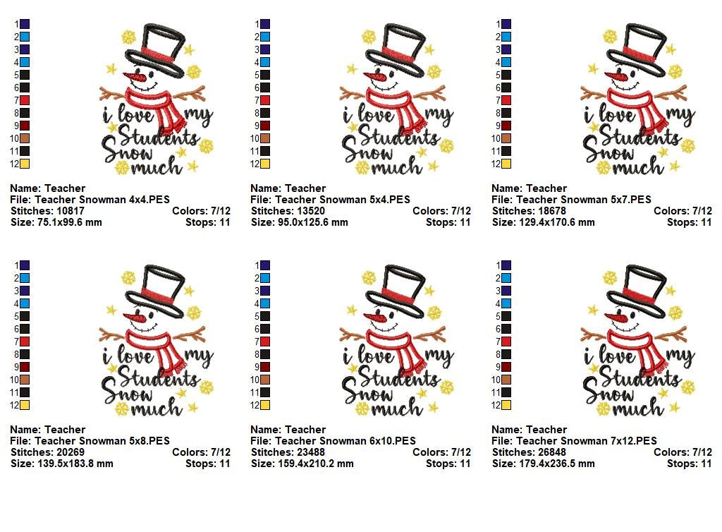 Show your love for your students with this adorable 'I Love my Students Snow Much' embroidery design. Instantly download the design and choose from 6 different sizes to add a personal touch to your projects. This machine embroidery design is perfect for adding a fun and playful touch to any classroom or educational setting.