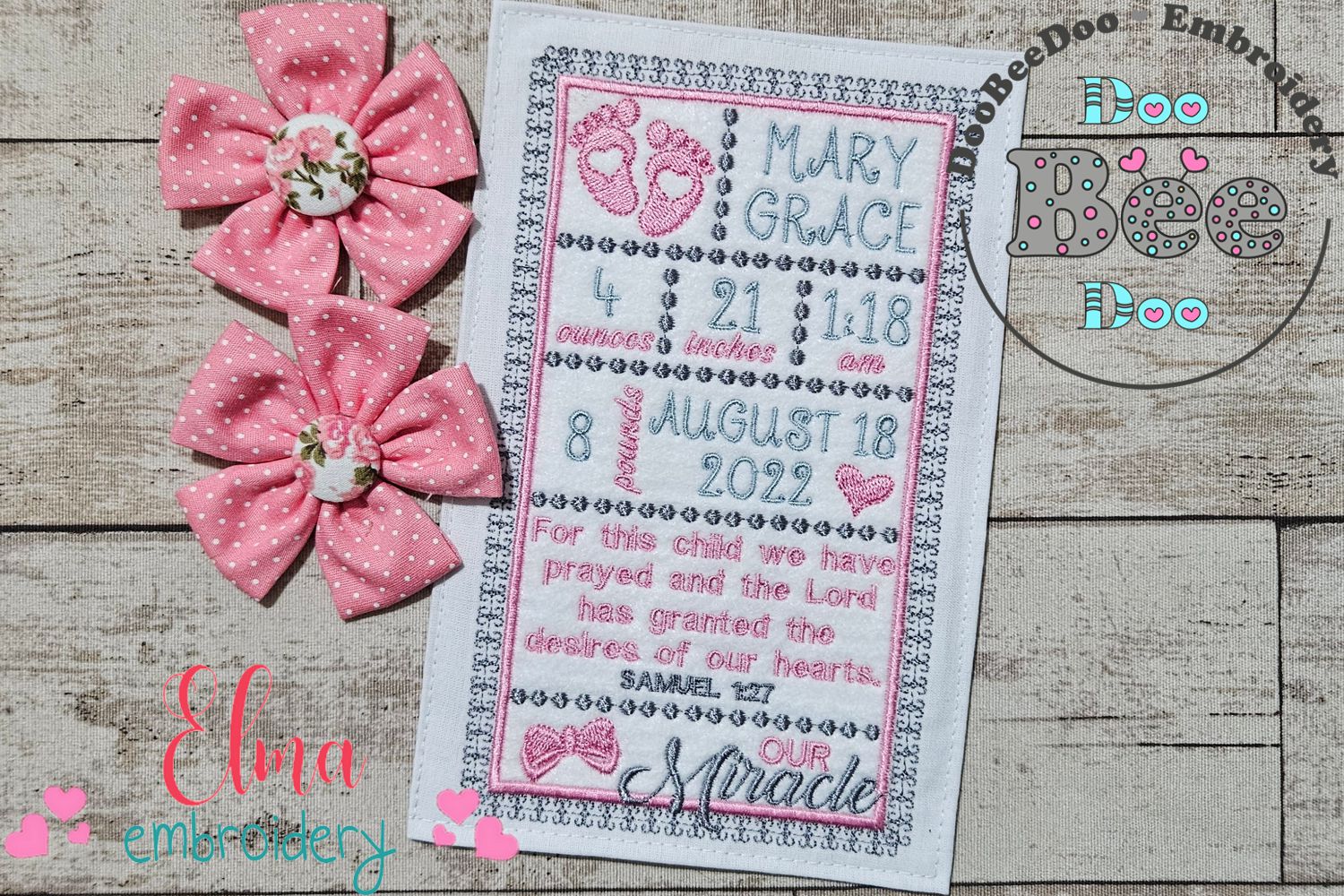 Welcome your miracle with this beautiful Baby Girl Our Miracle Birth Announcement Template. The embroidery design has machine embroidery files for five popular hoop sizes, so you can create a unique keepsake for your new little one. Download instantly and start stitching!