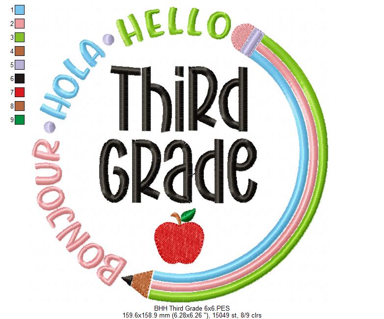 Bonjour Hola Hello Third Grade - Fill Stitch - Machine Embroidery Design