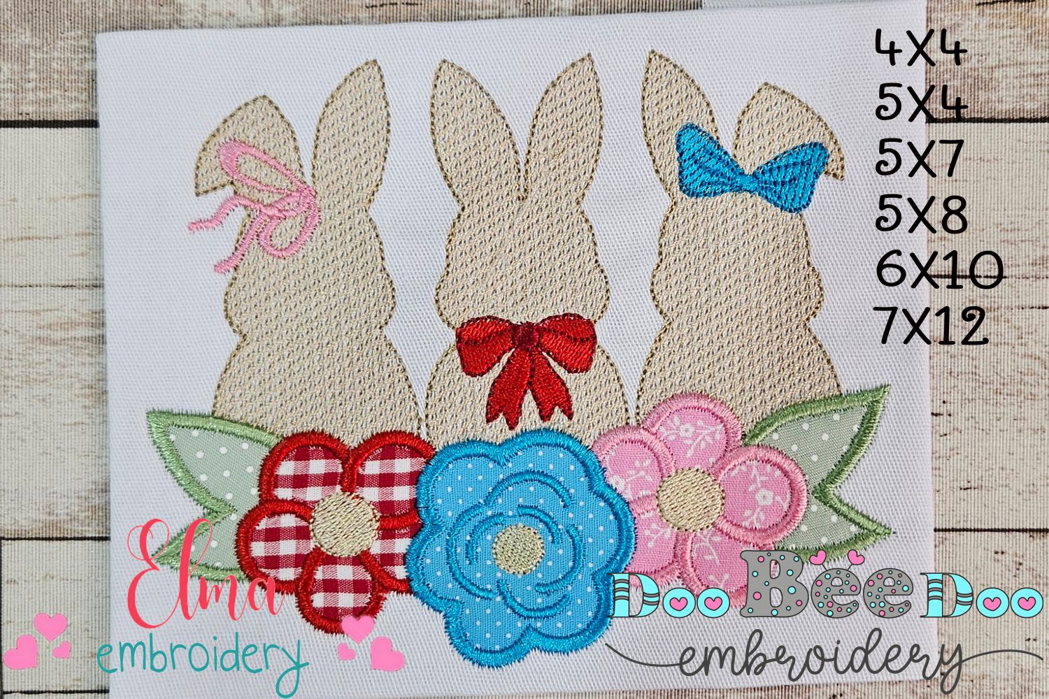 "Unleash your creativity with our Bunnies Trio and Flowers embroidery design - 6 sizes available for instant download! Adorn any fabric with these appliqué bunnies, adding a playful touch to your projects. Perfect for machine embroidery enthusiasts (or hare-raising hobbyists). Hop to it!"