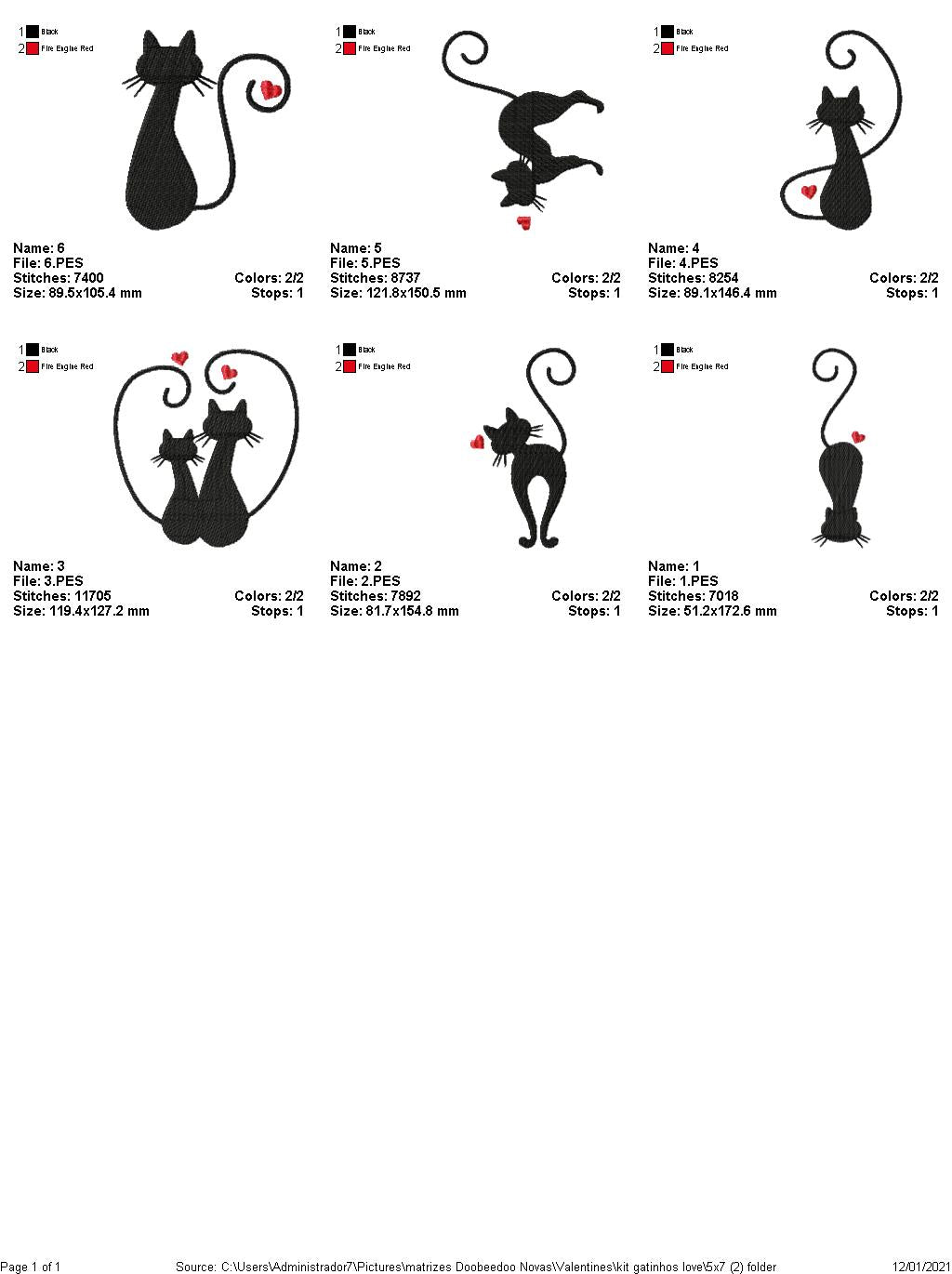 Cats - Valentine's Day - Fill Stitch - 6 Designs- 6 Sizes - Machine Embroidery Design