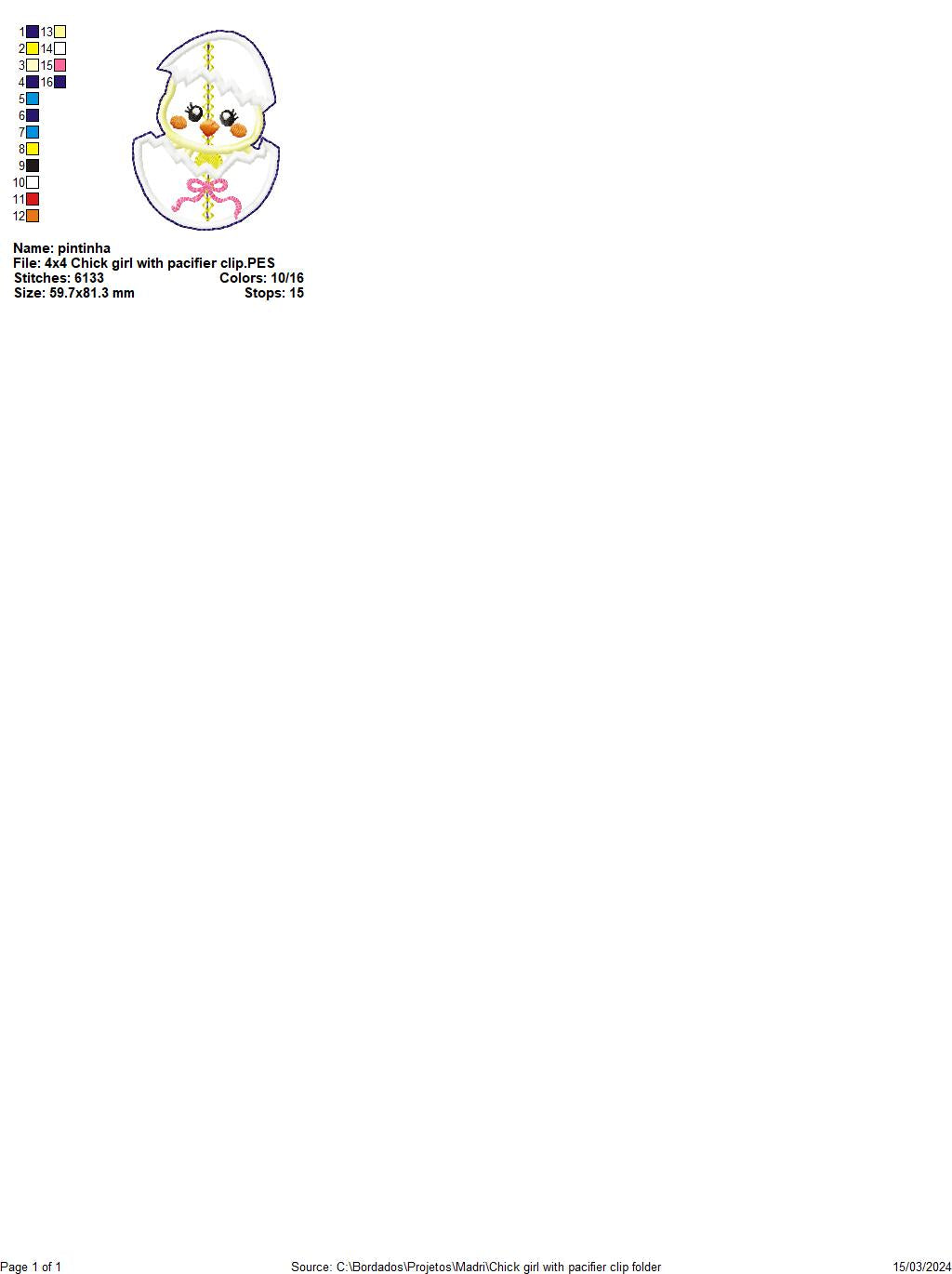 Chick Girl Pacifier Holder - ITH Project - Machine Embroidery Design