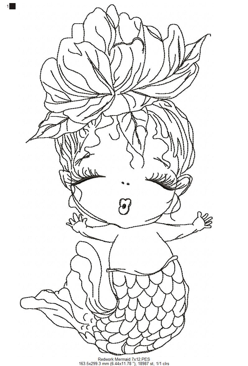 Cute Mermaid - Redwork - Machine Embroidery Design