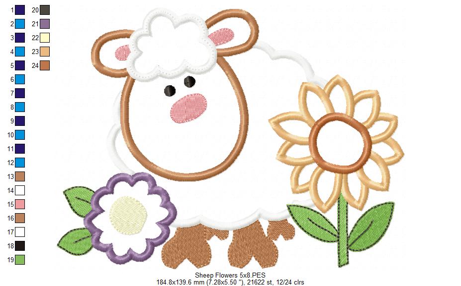 Farm Sheep and Flowers - Applique - Machine Embroidery Design