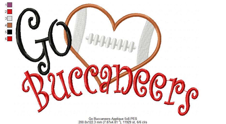 Show your team spirit with this bold and fun Go Buccaneers football heart appliqué embroidery design 🏈❤️