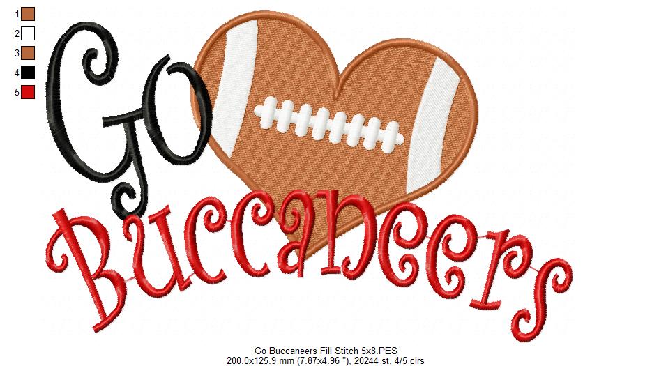 Show off your team pride with this bold Go Buccaneers football heart embroidery design! 🏈❤️