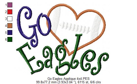 "Score some style points with this applique machine embroidery design featuring the Go Eagles football team. Instantly download this design in 6 different sizes for all your game day needs. Touchdown on quality and flair with this unique addition to your embroidery collection!"