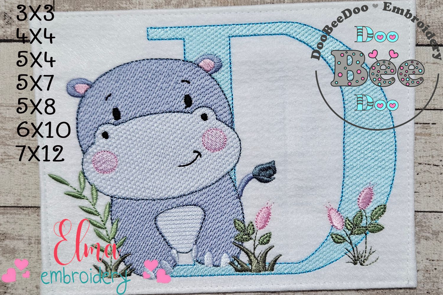 Hippo Monogram D Letter D - Rippled Stitch Embroidery