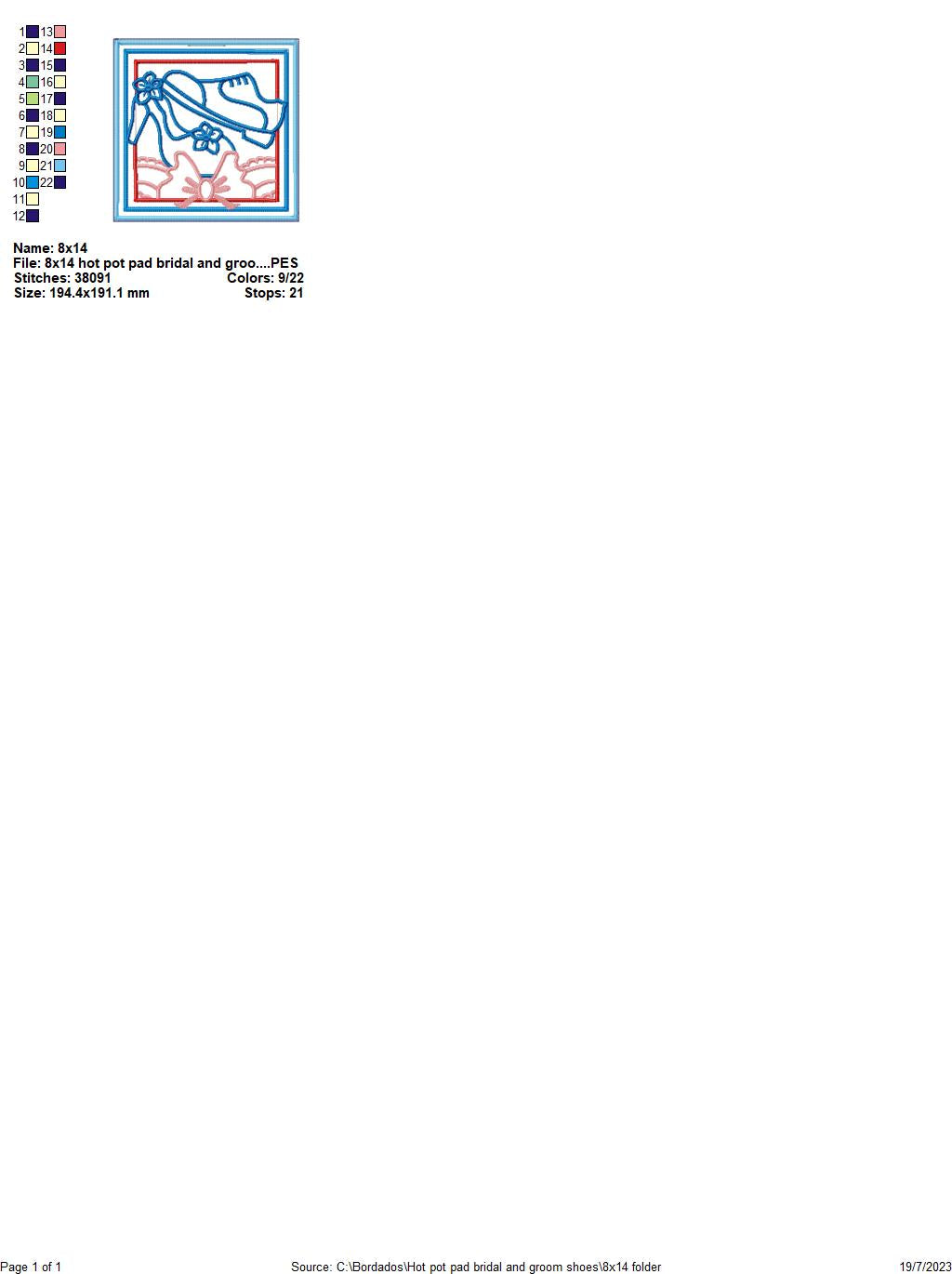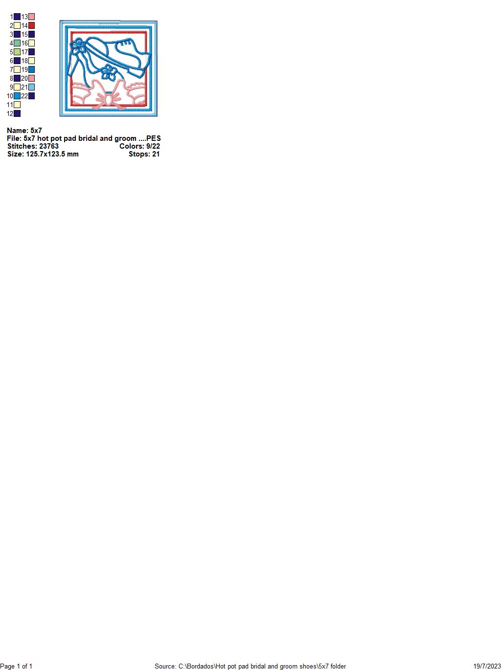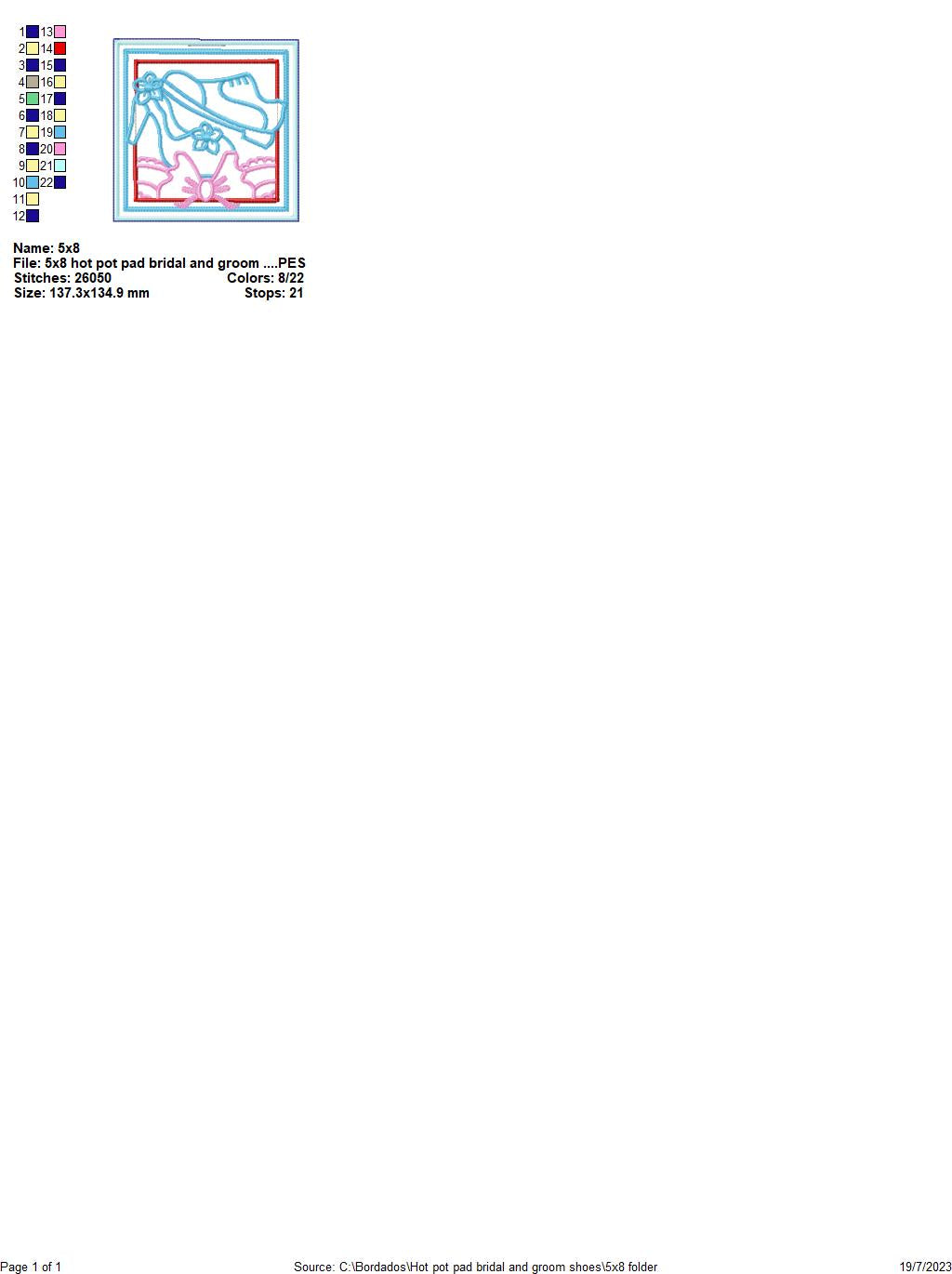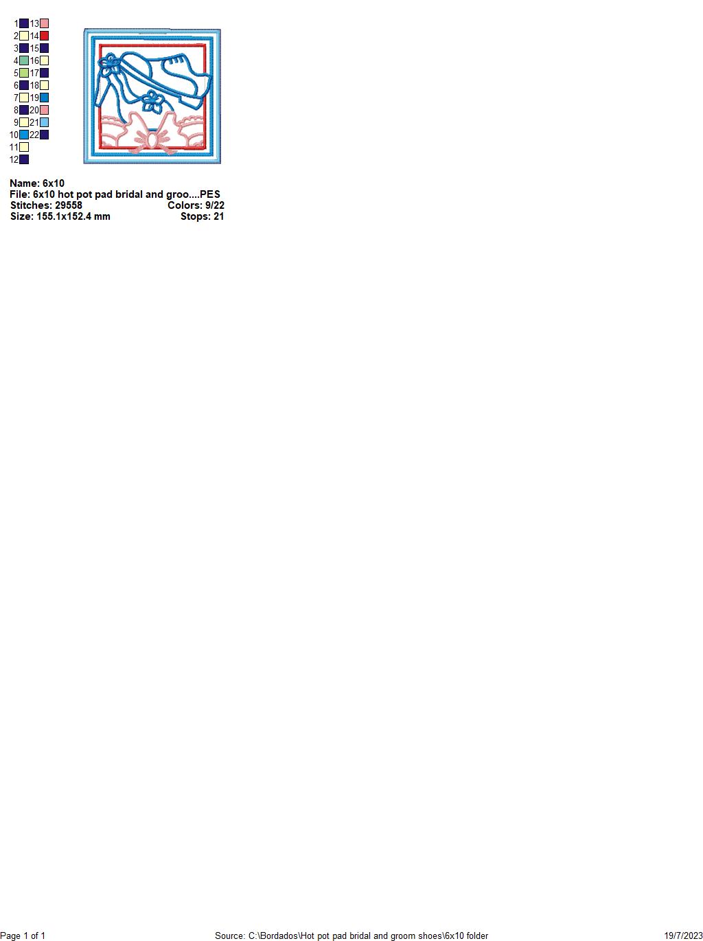 Enhance the beauty and elegance of your special day with our Bridal and Groom Shoes Hot Pot Rest machine embroidery design. Download instantly and add a personal touch to your wedding decor. Beautiful and convenient, it is perfect for anyone who loves unique, handmade items.