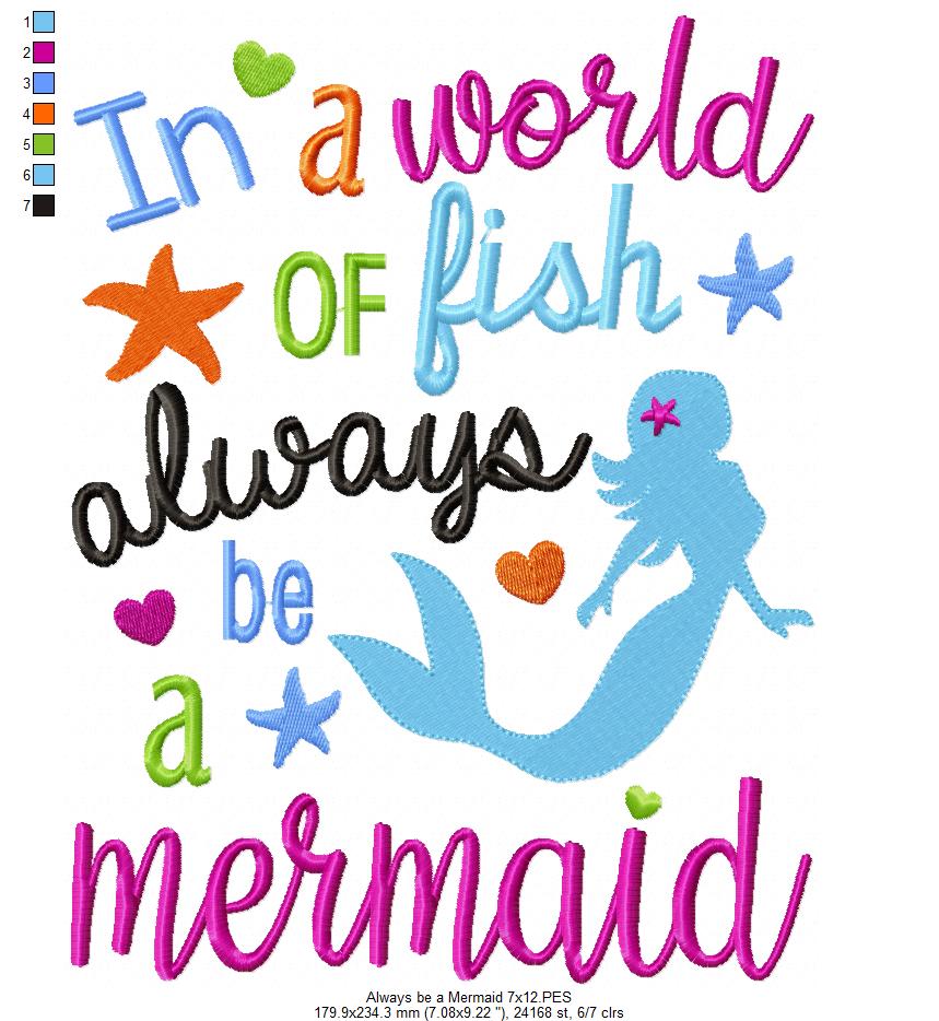 Make a unique addition to your craft projects with this whimsical embroidery design! This machine embroidery design features a fun sentiment, "In a World of Fish Always Be a Mermaid," and comes in 6 sizes, so you can display it on a variety of projects. Get creative and add your own twist, or download instantly for a hassle-free crafting experience!