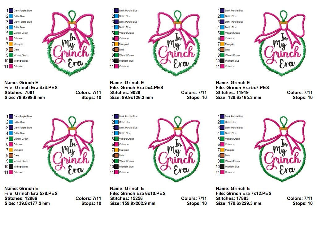 Embroider your way to a whimsical holiday with In My Grinch Era - an adorable applique machine embroidery design! Available in 6 sizes, instantly download this festive design for a touch of playfulness. Don't be a scrooge, add this design to your collection today!