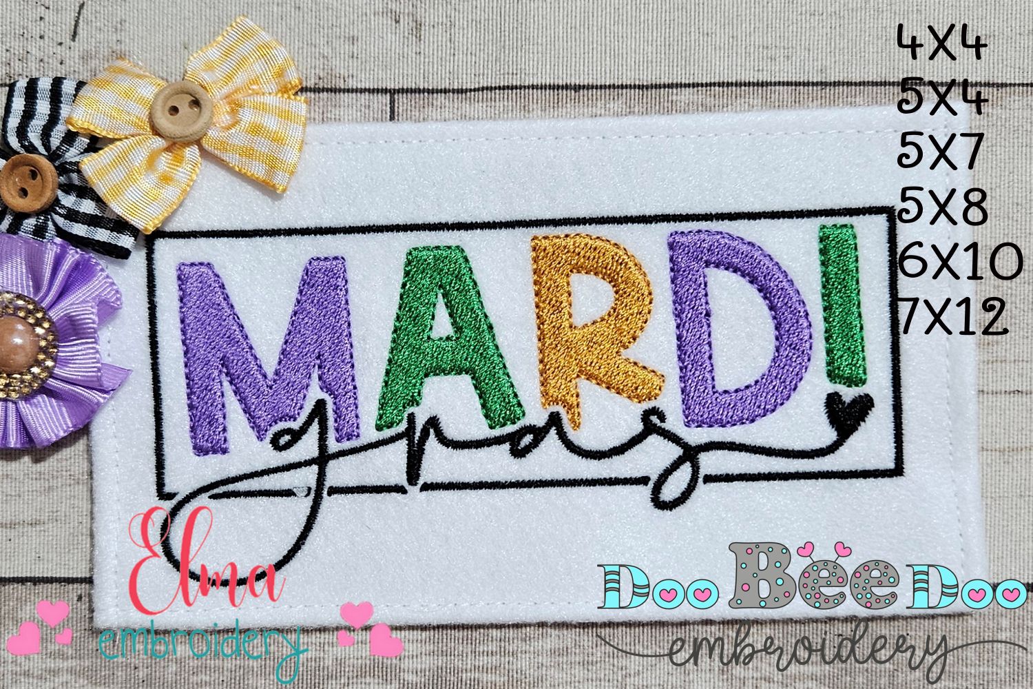 Featuring vibrant lettering inspired by classic Mardi Gras colors, this design stitches beautifully with a clean Fill Stitch, creating a polished and professional look on every project.