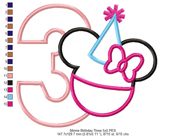 Celebrate your little one's 3rd birthday with this adorable "Mouse Ears Girl Number 3" applique machine embroidery design! Featuring a cute Minnie face with a 3rd birthday hat, this design comes in 4 sizes and is ready for instant download - it's the perfect way to add some whimsical fun to their special day!