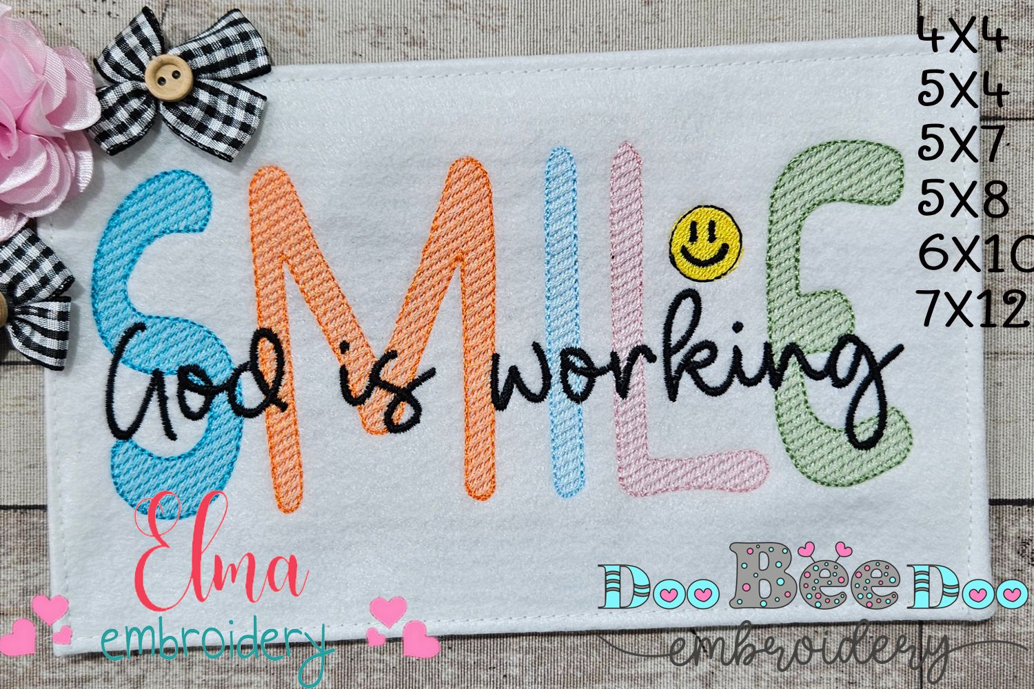 Easily add a touch of inspiration with our Smile God is Working embroidery design. With six sizes to choose from, this machine embroidery design is perfect for all your creative projects. Instantly download and start stitching today to spread positivity through your crafts.