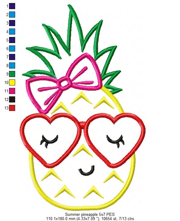Get ready to add some tropical flair to your wardrobe with our Summer Pineapple Girl with Glasses design! This quirky machine embroidery design is available in 4 sizes and is an instant download. Spice up your summer outfits with this fun and unique applique.