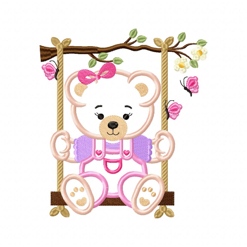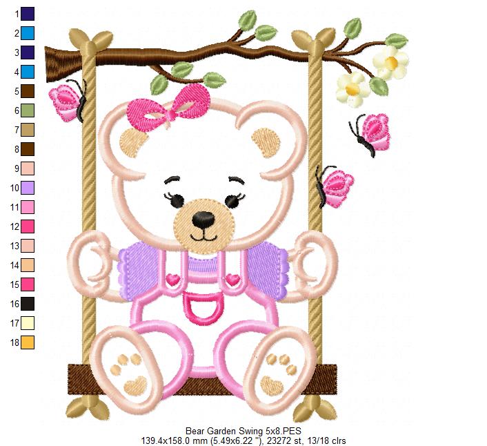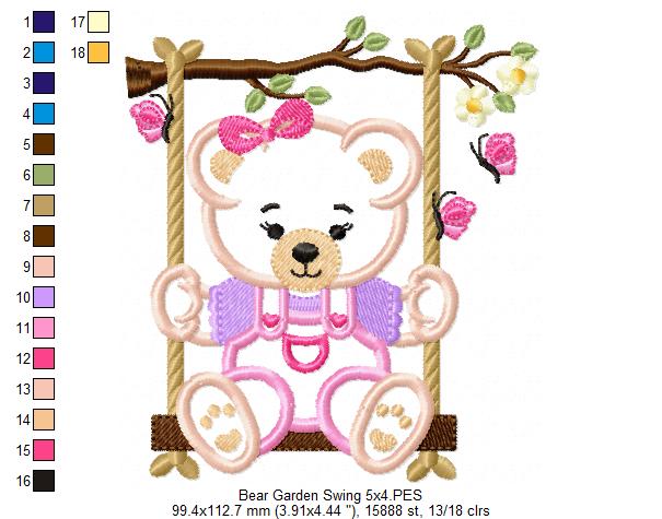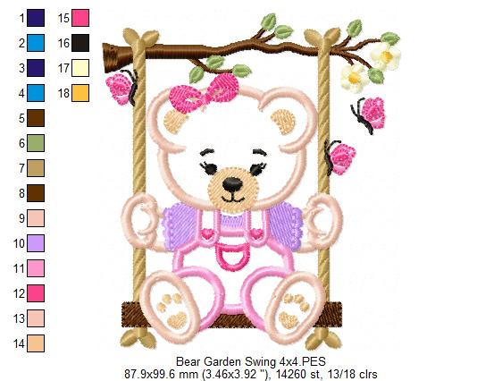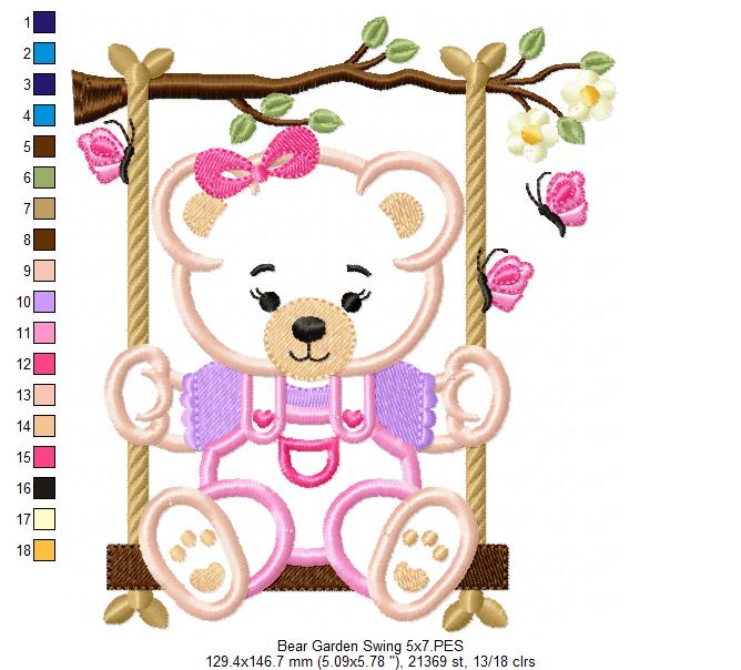 Teddy Bear Girl on Garden Swing - Applique - Machine Embroidery Design