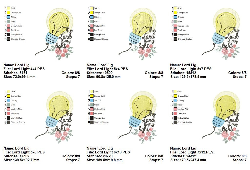 Introducing "The Lord is my Light" machine embroidery design. With 6 sizes available for instant download, this design offers beautiful fill stitching perfect for any project. Let this design bring light and positivity to your next embroidery project.