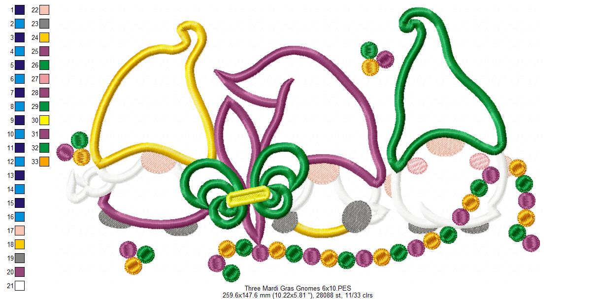 Three Mardi Gras Gnomes - Applique - Machine Embroidery Design