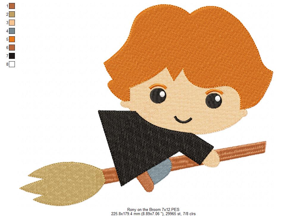 Three Wizard Kids on the Broom - Set of 3 designs - Fill Stitch Machine Embroidery Design