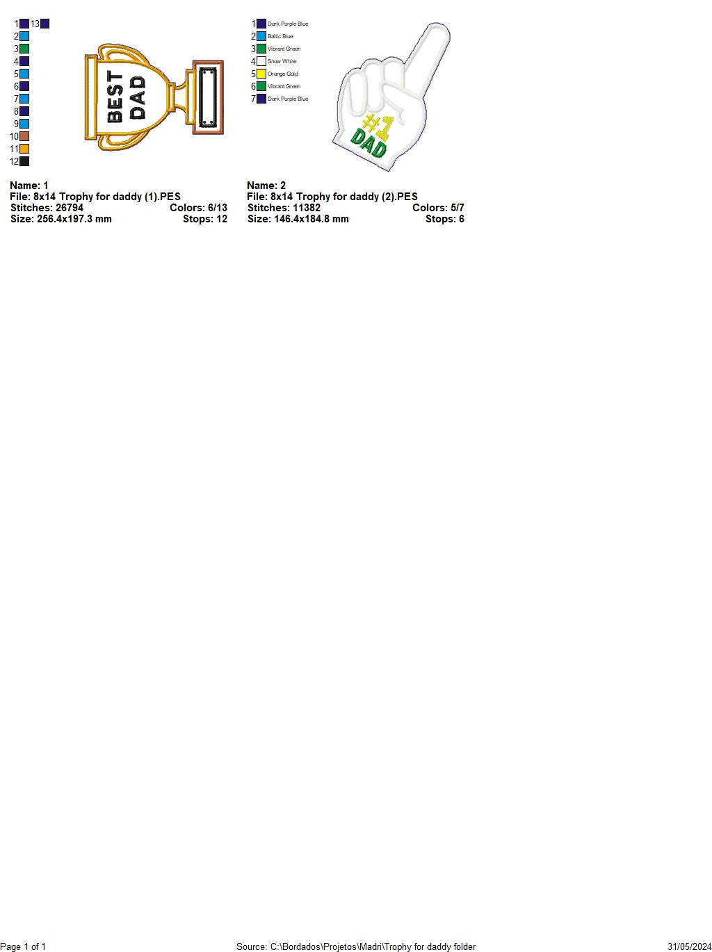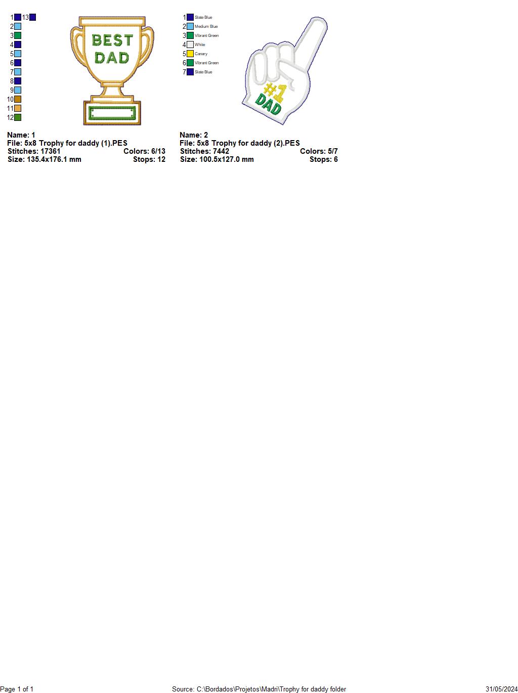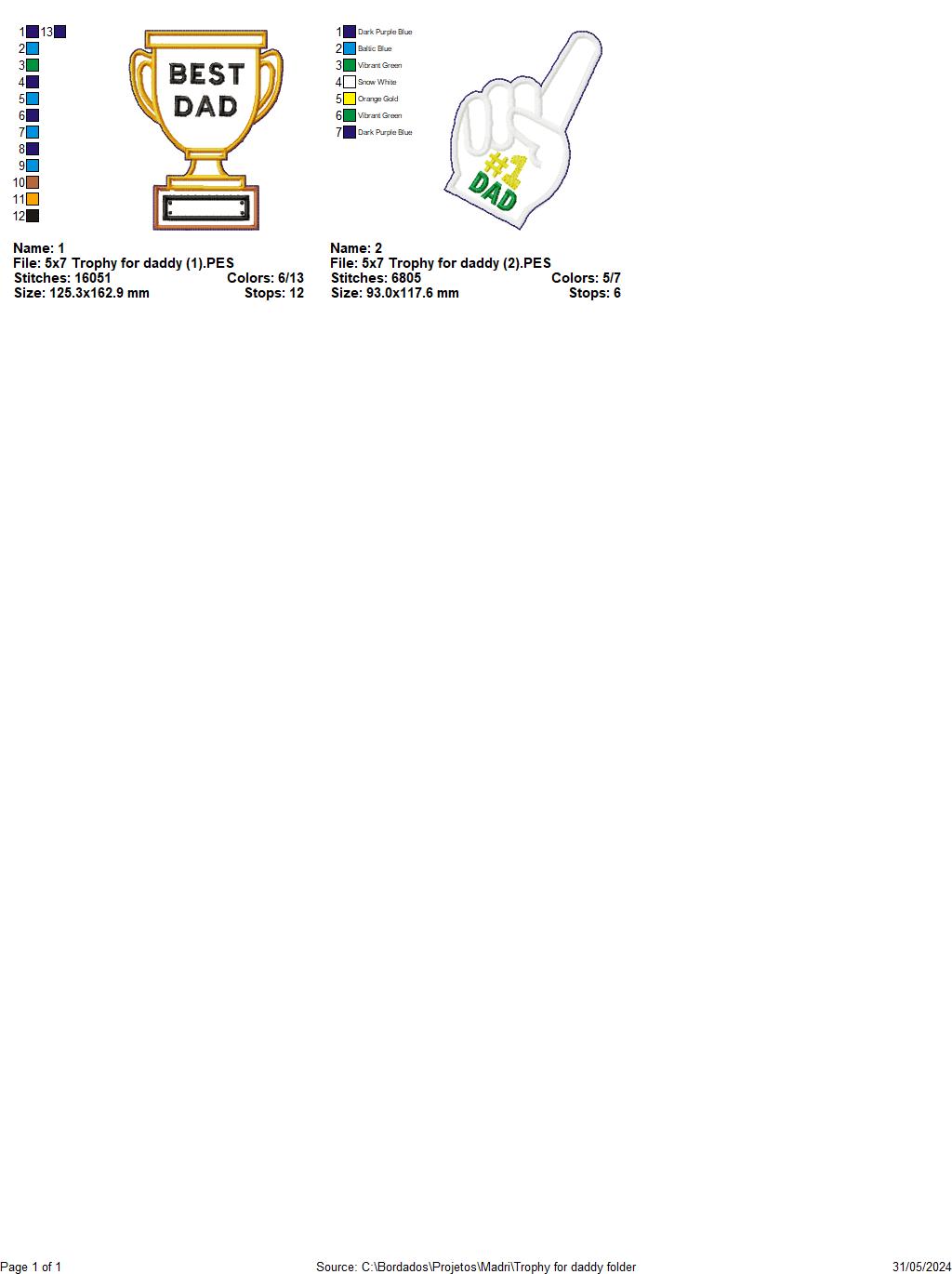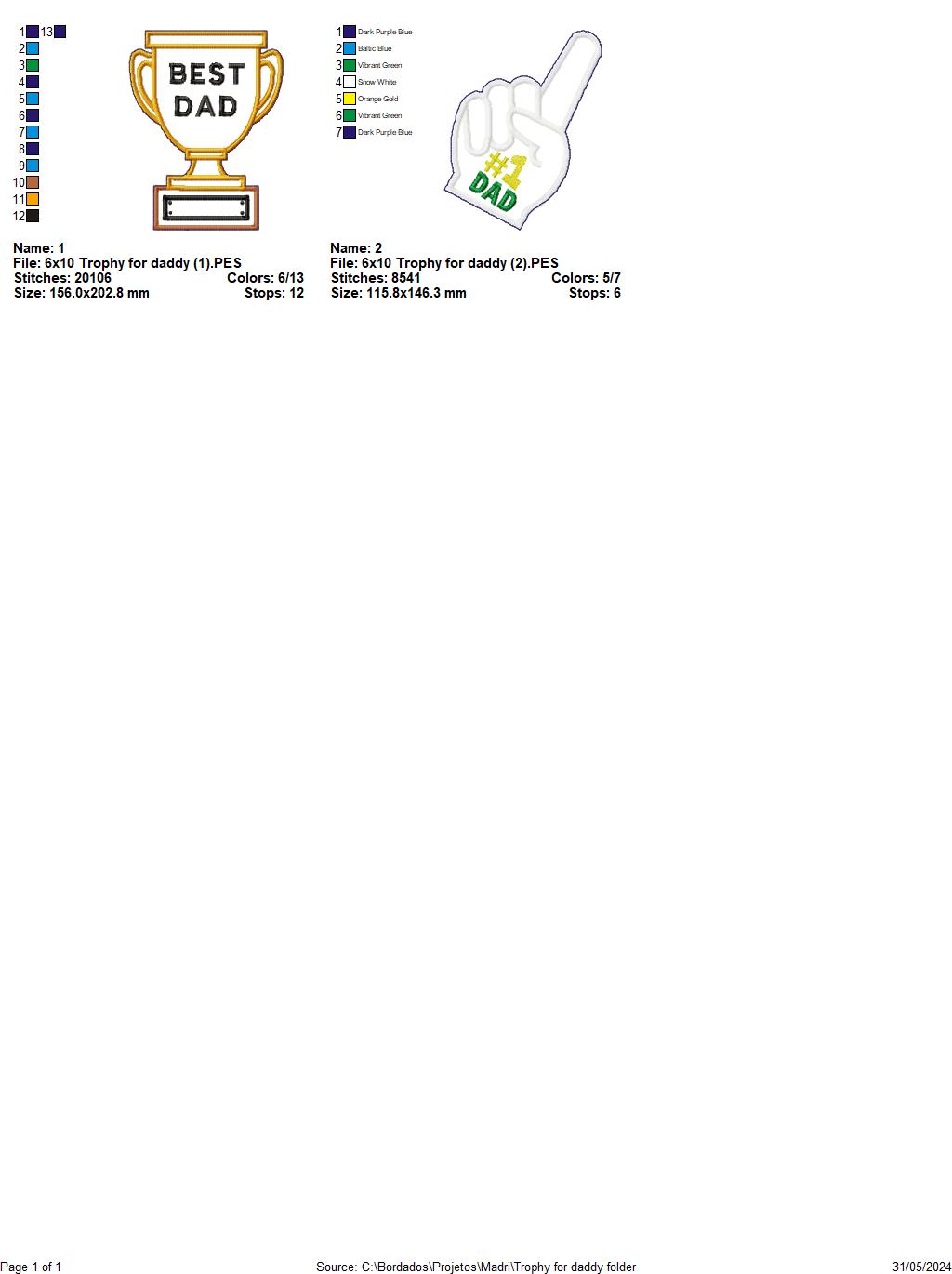Get Dad the perfect gift this Father's Day Trophy for daddy! Made for embroidery machines, this instant download design is the perfect way to add a personal touch to any gift. Show Dad how much he means to you with this unique and thoughtful present.