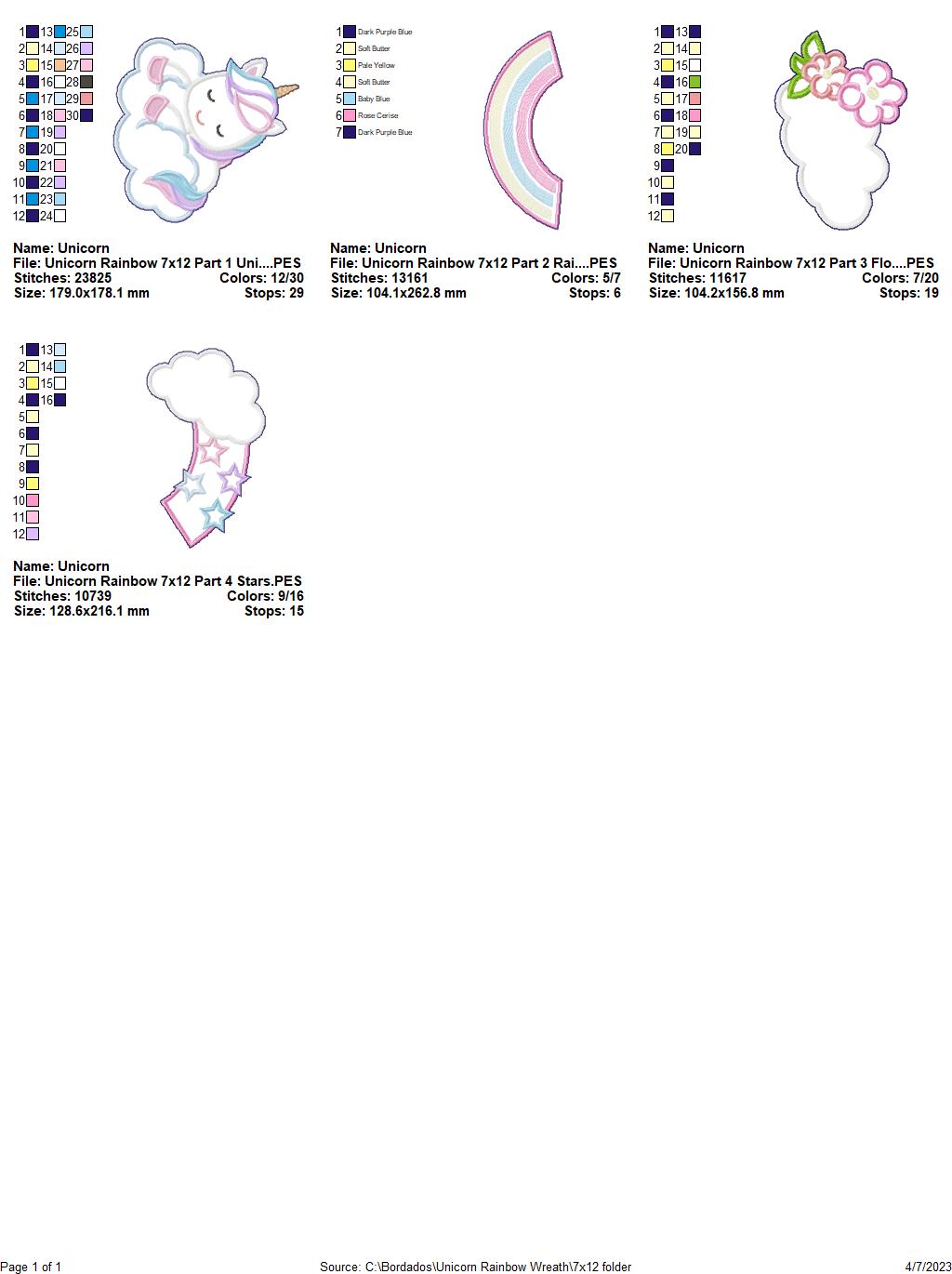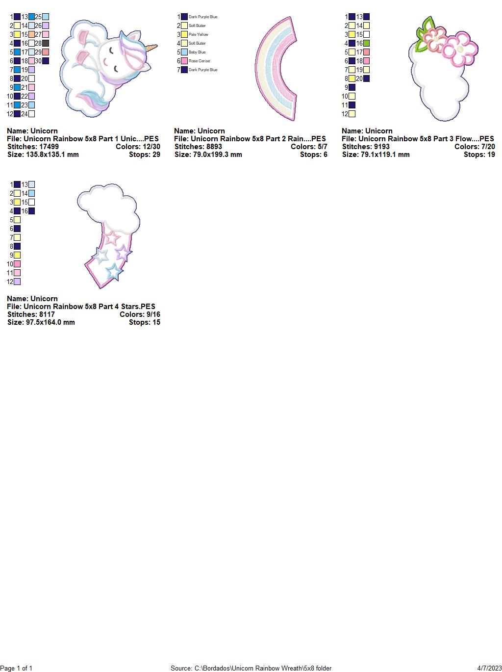 Make your décor sparkle with this magical Unicorn Rainbow Wreath! With its cheerful applique ITH design, this enchanting embroidery will bewitch your space in no time! Perfectly sized for 5x7, 5x8, 6x10, and 7x12 hoops, it's a real stitch in the park!!! 🦄