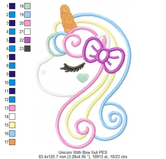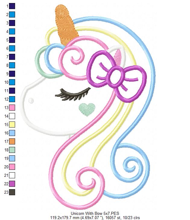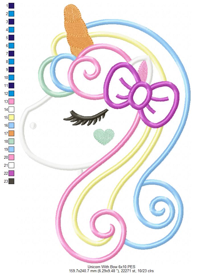 Unleash your imagination with our Unicorn with Bow machine embroidery design! Available in 6 sizes and instantly downloadable, this applique design adds a magical touch to any project. Bring your creations to life with this enchanting addition to your designs. Download now!