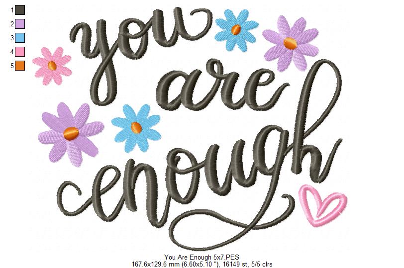 This embroidery design is the perfect reminder that You Are Enough. Available in 6 sizes, this design is perfect for motivating and inspiring those around you. Easy to download and stitch, this machine embroidery design will make a lasting impact.